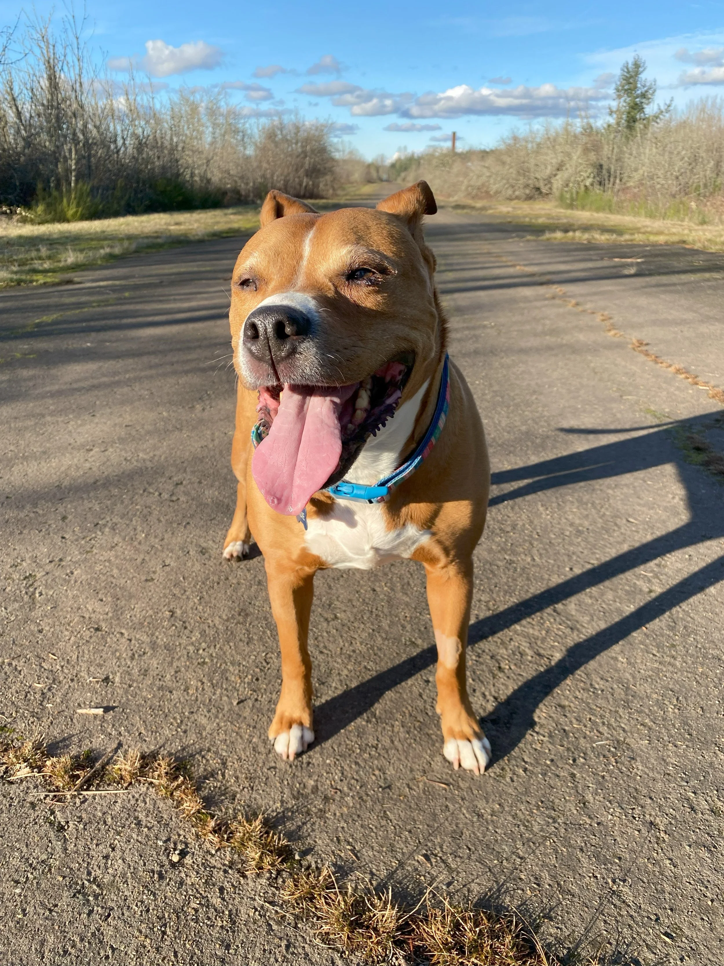 It was a snowy December day when foster volunteer (and now SDRO adoption coordinator) Theresa Stephens and her husband drove to Central Oregon to pick up their first SDRO foster dog, Sadie. Theresa had joined SDRO the previous summer and felt ready to start fostering, but her excitement was tempered by nervousness since this was her first foster and a Pit Bull.